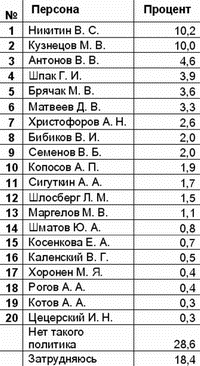 Всего избирателями области были названы 33 персоны, список 20 первых мы публикуем (см. таблицу).