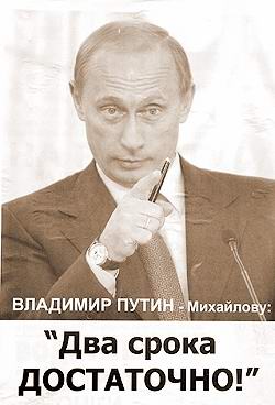 Плакаты заполонили собой все сколь-либо пригодные для размещения настенной агитации места на территории области. Лицо президента, безусловно, обращало на себя внимание. При ближайшем рассмотрении на плакате читался текст: «ВЛАДИМИР ПУТИН – Михайлову: «Два срока достаточно!».