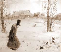 На некоторых работах изображена жизнь поэта как обычного человека. Он нарисован в простой одежде, в лаптях. Единственным неизменным атрибутом на всех картинах остается высокий цилиндр, даже в бане и за столом Пушкин в этом головном уборе. Отдельные работы – такие, как «Вспоминая Анну Керн», вызывают улыбку уже только тем, что позы персонажей относят зрителя к известной картине «Охотники на привале».