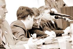 Заключительную часть, выступления представителей общественных организаций, президиум дослушивал уже с явным усилием. Юлия Никифорова (ЦПГИ «Участие»), предложившая конкретные способы борьбы с коррупцией [ 1 ] и практическую помощь в их осуществлении никакого отклика не получила. Венедикт Достовалов, призвавший провести полное расследование деятельности всей администрации Евгения Михайлова (в том числе присутствовавшего Дмитрия Шахова) был выслушан с улыбкой, а Надежда Доновская (которая привела конкретные примеры коррупции в области) – уже с раздражением. Несколько раз вспомнили о регламенте, Михаил Кузнецов торопился покинуть круглый стол и успеть на следующую встречу.