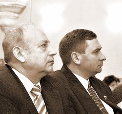 | Михаил Хоронен и автор «депутатского Устава» Иван Цецерский разными глазами смотрели на выступавших псковичей. Фото: Александр Тимофеев. |