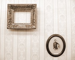 | Пустая рама, оставленная похитителями пейзажа. Рядом – портрет Василия Корвин-Круковского, автора похищенной картины. Фото: Юрий Стрекаловский. |