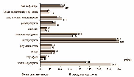Запасы муки, крупы, макаронных изделий в сельских домохозяйствах в 2005 году превышали запасы горожан в 1,4-1,7 раза. Покупка продуктов питания впрок сельскими жителями объясняется узким ассортиментом, нерегулярностью поставок, низким качеством продовольственных товаров в сельских магазинах. Это связано еще и с тем, что почти 22 процента домохозяйств проживает в сельских населенных пунктах, где нет продовольственного магазина, и лишь в каждый шестой из них осуществляется доставка продуктов автолавкой 2-3 раза в неделю (по материалам обследования домашних хозяйств).