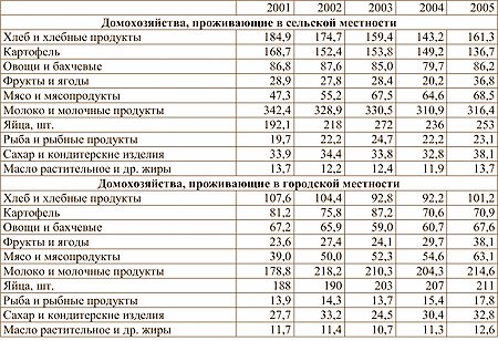 В 2001-2005 годах наблюдаются изменения в рационе питания сельского населения. Потребление молока и молочных продуктов сельским населением уменьшилось в 2005 году по сравнению с 2001 годом в среднем на одного человека на 7,6 процента, хлеба и хлебопродуктов – на 13, картофеля – на 18 процентов. И напротив, возросло потребление мяса и мясопродуктов – на 44,7 процента, яиц – на 31,8, фруктов и ягод - на 28,6, рыбы и рыбопродуктов – на 15, сахара и кондитерских изделий - на 11,8 процента. Вместе с тем в 2005 году потребление картофеля сельским населением было на 92,9 процента больше, чем городским, хлебных продуктов - на 59,4, молока и молочных продуктов - на 47,4, рыбы и рыбопродуктов – на 30,1, овощей и бахчевых – на 27,5, яиц – на 20,2, сахара и кондитерских изделий – на 16,1, мяса и мясопродуктов – на 8,5, масла растительного и других жиров – на 8,4 процента.