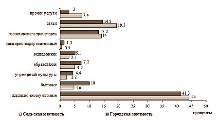 Расходы на оплату услуг сельским населением в 2005 году были ниже расходов городского населения на 42,5 процента. Основную долю в расходах как у сельского, так и у городского населения занимали жилищно-коммунальные услуги, у сельского населения они составляли в среднем на человека 173 рубля в месяц, у городского – 282 рубля.