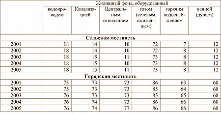 За 2001-2005 годы уровень благоустройства жилья в сельской местности практически не изменился. По состоянию на конец 2005 года 82 процента домохозяйств в сельской местности не имели водопровода, 85 процентов – канализации, 89 процентов – центрального отопления, 92 процента – горячего водоснабжения.