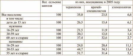 Женщины чаще мужчин обращались за медицинской помощью к врачам различной специализации. Часть сельских жителей (7%) не обращалась в медицинские учреждения за получением помощи, хотя такая необходимость была. Причины, по которым сельские жители не обращались в медицинские учреждения в 2005 году следующие: не было возможности оплатить медицинские услуги (0,7% от числа лиц, не обратившихся за медицинской помощью); необходимая медицинская помощь отсутствовала по месту жительства (6,9%); не было времени, лечились самостоятельно и по другим причинам (92,4%).