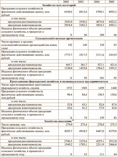 В 2001-2005 годах продолжалось сокращение объемов производства основных видов сельскохозяйственной продукции в сельскохозяйственных организациях и хозяйствах населения. Объем валовой продукции сельского хозяйства всех сельхозпроизводителей в 2005 году в действующих ценах по расчетам составил 8925,3 млн.рублей, при этом на долю сельскохозяйственных организаций приходилось 27 процентов объема валовой продукции, крестьянских (фермерских) хозяйств и индивидуальных предпринимателей – 1,5 процента, хозяйств населения – 71,5 процента. Объем продукции сельского хозяйства в хозяйствах населения составил 6379,8 млн.рублей и уменьшился по сравнению с 2004 годом на 16 процентов.