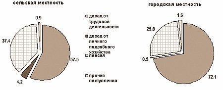 По материалам выборочного обследования, в 2005 году 57,5 процента сельских домашних хозяйств считали доход от трудовой деятельности основным источником средств существования, 37 процентов – пенсию, 4 процента - доход от личного подсобного хозяйства.