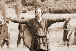 Действо, надо признать, светилось подлинностью: ландшафт Мальской долины (организаторы выбрали известное плато над Городищенским озером, под скатом кладбищенского холма на подступах к Труворому городищу), чистый пейзаж, заботливо спрятавший в июньской зелени любые «признаки цивилизации» и непривычная чистота на земле (как потом выяснилось, организаторы предварительно собрали и вывезли несколько мешков «туристического» мусора).