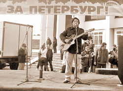 Тон митингу был задан музыкой. Началось с Высоцкого – его песни очень любит исполнять Михаил Новицкий (по совместительству один из лидеров движения «Зеленая волна», занимающегося охраной скверов, парков, аллей и пригородных зеленых массивов) с группой «СПБабай». Потом на сцене появился Юрий Шевчук со знакомым не одному поколению: «Ты не дай мне сейчас закатать рукава…»