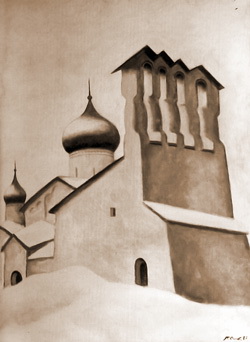 Обращаясь к творчеству П. П. Оссовского, мы встречаем искусство, полвека назад взошедшее на близкую к абсолютной высоту и, тем не менее, каким-то образом ещё себя повышавшее в продолжение десятилетий. Посмотрим, как пишет художник белые псковские церкви на фоне дымного зимнего неба, над белым снегом на земле! Такой мотив – сложнейшая задача. Изображения Мирожского собора, церкви Богоявления с Запсковья, присутствующие в экспозиции, всегда будут служить образцами тем художникам, которые ещё обратятся к псковской архитектуре.