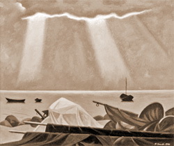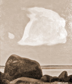 Только одна из картин, выставленных в Псковском музее, даёт отчётливый намёк на такой опыт и его преодоление. Это «Вечернее облако» (картон, масло, 2000 г.). «Работая» в паре с другой картиной («Чёрная лодка, белые чайки»), «Вечернее облако» представляется своеобразным «манифестом» автора. Художник словно говорит: «мнимые глубины пост-модерна – мрачный сюрреализм, метафизическое одиночество – для меня не закрыты; и я мог бы с большой силой и оригинальностью всё это воплотить». Но модернистская эстетика несовместима с реалистическими корнями творчества.
