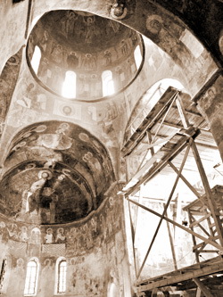 Архитектурно-археологические раскопки в Спасо-Преображенском соборе и вокруг него, проведенные в 2008-2009 гг. [ 2 ], были ограничены до минимума (их площадь составила всего 26,8 кв. м.), но они были жизненно необходимы: благодаря им был исследован вопрос о техническом состоянии фундаментов и нижних частей стен, на которых зиждется собор с его уникальной настенной живописью.