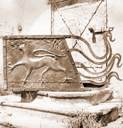 А в тех городовых воротех 4 щита деревянные, обняты полосами и побиты площами железными на железных крюках, в том числе в одном середнем щиту неболшая прикалиточка».