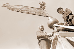 Установка прапора Власьевской башни в 1966 г. На снимке: архитектор Б. С. Скобельцын и бригадир плотников В. Махаджанян. Фото М. И. Семенова, 1967 г.