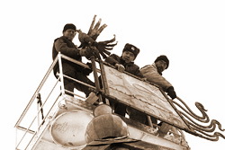 Установка прапора над Власьевской башней. Кузнецы Павел Шаповалов (справа), Андрей Степанов (слева), сотрудник МЧС Анатолий Селиванов (в центре). Фото: Лев Шлосберг