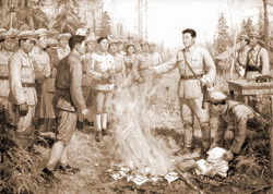 | «Товарищ Ким Ир Сен сжигает решения ХХ съезда Коммунистической партии Советского Союза». Северокорейский плакат. |
