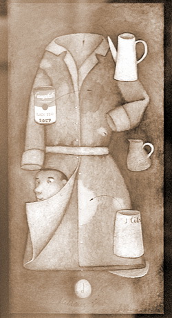 В своём «первом смысловом приближении» он местами прямо вышучивает эклектику постмодерна. В одной из иллюстраций к «Вредным советам» Григория Остера изображена некая самодовлеющая шинель – почти гоголевская (ибо многое из неё «выходит»). Она изъязвлена разноцветными пятнами от разных загрязнителей. Каждое пятно имеет изобразительную «сноску». Чертёжная стрелочка ведёт глаз зрителя к причине пятна. Вместе эти пятна со ссылками представляются специфическим постмодерновым набором цитат и заимствований из самых разных исторических и географических областей культуры. В числе прочего здесь есть и «привет» Энди Уорхолу [ 2 ] (1928-1987) – одна из его знаменитых банок томатного супца “Campbells”.