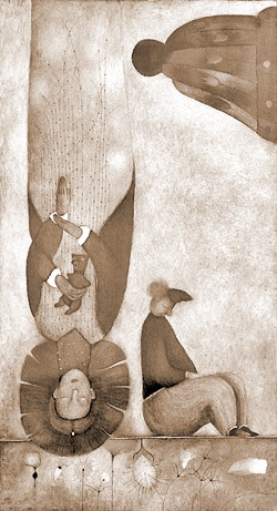 На одной из работ Милдеберга присутствует совсем крошечное яблоко, из которого соразмерно вырастает раскидистое безлистное дерево. А всё это вместе с удивительной простотой и ясностью символизирует, конечно, целую Землю – весь повреждённый грехопадением человеческий мир.
