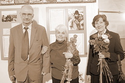 | Кирилл Борисович Скобельцын, Инга Константиновна Лабутина и Надежда Борисовна Грошева (Скобельцына) на открытии выставки к 90-летию Б. С. Скобельцына. Приказные палаты Псковского Кремля, 30 апреля 2011 г. |