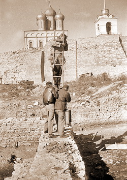 | Довмонтов город. 23 сентября 1963 г. Б. С. Скобельцын снимает археологические объекты с лестницы. Лестницу поддерживает В. Д. Белецкий (справа). |