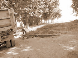 По дорожке к памятному знаку проводилась обрезка деревьев, причем насаждения, которые еще видели молодого Зиновия Гердта, безжалостно срезались. Тяжелая техника уже зачистила асфальт для укладки нового, а рабочие грузили мусор в подогнанную машину.