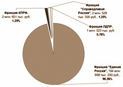 96,56% всех депутатских доходов принадлежат единороссам – это 195 млн. руб.! КПРФ досталось «на крохи» 2,6 млн. руб. (1,29%), «Справедливой России» - 2,53 млн. руб. (1,25%). На долю представителей ЛДПР приходится 1,52 млн. руб. (0,76%).