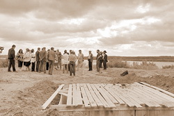 Анатолий Кирпичников до начала встречи обошел мыс городища и отметил: «Смотрите, оба склона – и северный, и южный – прямые, идут параллельно друг другу. Это ручная работа, несомненно. Думаю, что итальянская, новейшая технология для того времени».