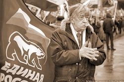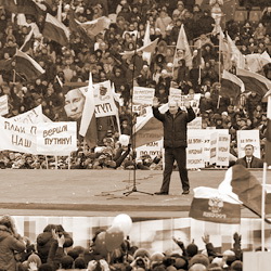 Никогда еще Владимир Путин со стороны не смотрелся так жалко. Кризис власти неминуемо сказался и на его команде. Поместить человека на огромном стадионе в центр пустой платформы – это надо было додуматься. Его фигурка почти растворилась в синем прямоугольнике.