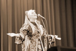 Название стиля этно-рок – достаточно условно. От корней Пелагея, конечно, не отрывается, но народных песен на концертах она исполняет не так много. В последние годы в ее репертуаре появилось несколько вещей, сочиненных гитаристом ее группы Павлом Дешурой и Светланой Хановой (мамой Пелагеи). На псковском концерте прозвучали «Омут» и «Степь», сочиненные ими.